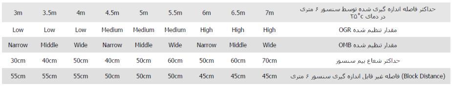 گزینه (OMB) که سه حالت دارد ( باریک=Narrow میانه=Middle پهن=Wide ) و در پهنای بیم سنسور نقش ایفا می کند و گزینه (OGR) نیز که سه حالت دارد ( ضعیف=Low متوسط=Medium قوی=High ) و در قدرت اندازه گیری امواج و یا حذف نویز موثر است که در مقدار فاصله اندازه گیری شونده توسط سنسور نیز تاثیر گذار است کاربر در شرایط خاصی که نیاز به کاهش بیم و یا حذف نویز اطراف سنسور دارد و یا با فضای کمی روبه رو می شود می تواند با تغییر و تنظیم مجدد این پارامترها بسته به نوع مشکل موجود یک نصب بدون دردسر را تجربه نماید به طور مثال اگر در حریم پرتو بیم سنسور مانعی وجود دارد و امکان جابجایی سنسور نیست می توان با تنظیم (OMB) بر روی گزینه Narrow و تنظیم (OGR) بر روی گزینه Medium یا Low مقدار بیم سنسور را تا حد چشمگیری کاهش داد و یا در صورت وجود نویزهای شدید در محل مانند نویزهای صوتی و یا الکترومغناطیسی با کاهش مقدار گزینه (OGR) مشکل را به کلی بر طرف نمود. گفتنی است این شرکت مقادیر کامل تست فاصله و پهنای بیم اندازه گیری توسط سنسور را در انواع حالتهای ممکن در کاتالوگ فنی سنسور در جدول مربوطه آن قرار داده است که برای اطلاع کافی از آن می توانید به آن رجوع نمایید.